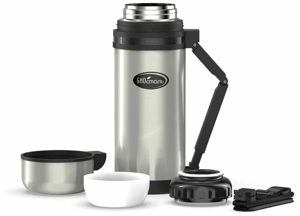 Дополнительные опции термоса - крышка-чашка; удобная ручка и ремешок для переноски; дополнительная пластиковая чашка.